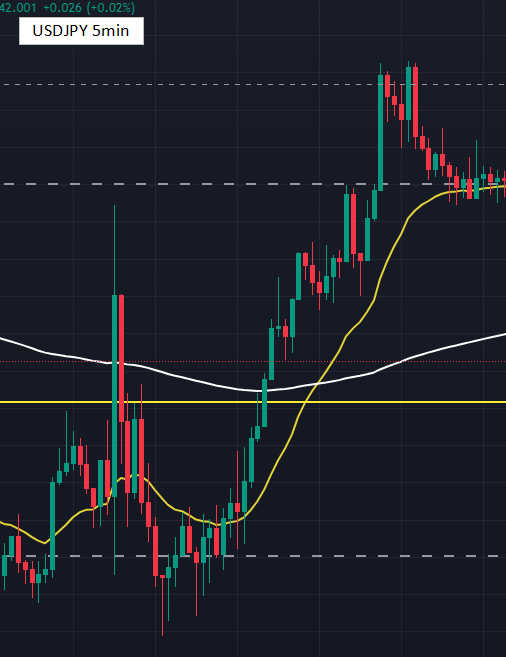 その証拠に、以下の図では USDJPY 142円のラウンドナンバーライン(下側のドット点線)から指標発表で暴騰した位置よりもさらに高いところまで上昇しています。