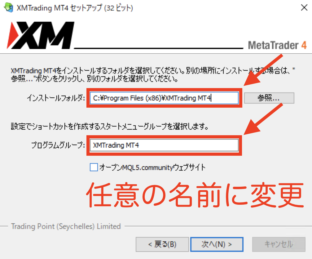 【インストールフォルダ】と【プログラムグループ】の項目を任意の名前に