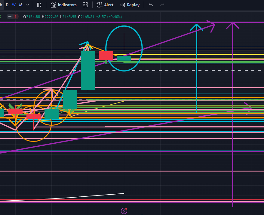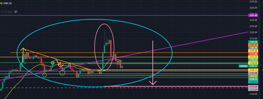次に下図の通りゴールド4時間足を見てみると、ディセトラを上に抜けましたが(教科書の教えの逆に抜けることが多い...)、これは上記で週足、日足で考察したことからそれらに対する短期足(4時間足)での騙し上抜けであり、ここから $2,132 近辺 (下向きピンク矢印の先端辺り) まで下降するイメージでいます。
