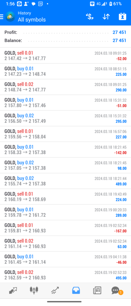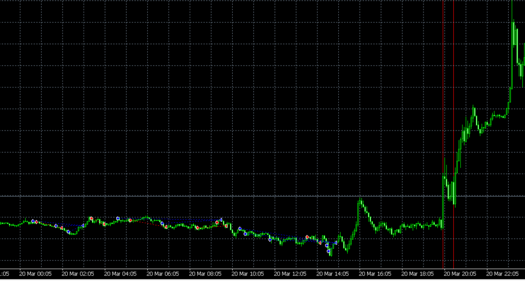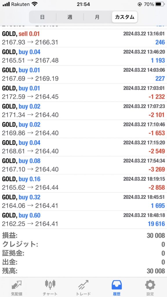 木曜日の早朝にFOMC政策金利発表やパウエル氏の公表 でゴールドが暴騰の値動きを見せていたようでしたが、それでもマルスは数時間前にはポジションを全て決済して無風でした。ポジションをどのように取っていたかが分かるようにチャートのスクショも以下に掲載しておきます。