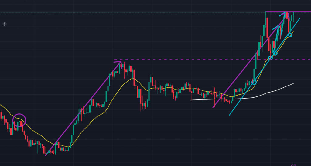 時間足を4時間足まで下げてみると、以下の図のオレンジのトレンドラインに反応して上昇を継続しているようにも見えます。ここから4時間足レベルで上昇を継続しても、週足で見たようにボラが紫の水平ラインとオレンジのトレンドライン内にスクイーズしていき、最終的にこのトレンドラインを下に抜ける確率が高いと僕は見ています。