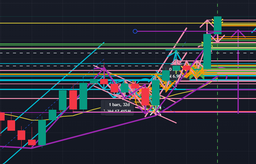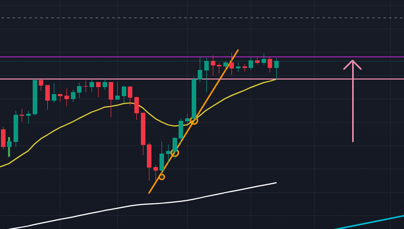ドル円の月足の様相は変わらず、週足を見てみると(下図)、2週間前に月足の紫色の抵抗ラインに下からタッチした後に小さく下へ反発し、そこから再度この月足ラインへコマ足で上昇し直したように見えます。アセトラに見える右スペースからドル円はまだこの価格帯でもみあった値動きをするかとも先週まではイメージしていましたが、ゴールドが月足と日足のエリオット波動上昇3波を完了したところから察して、ドル円では週足で見えるアセトラ上限を上に抜けてくるシナリオも見え始めました。