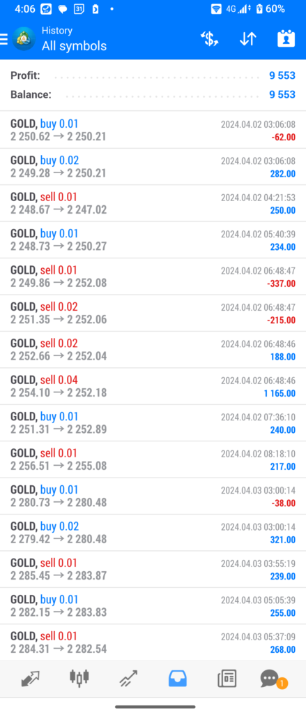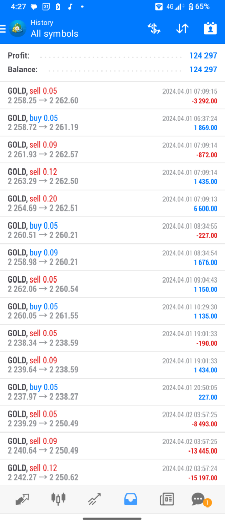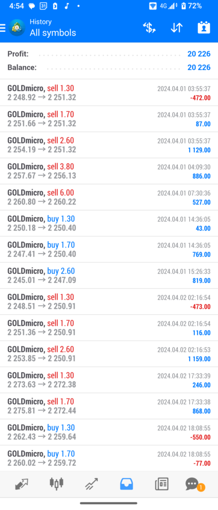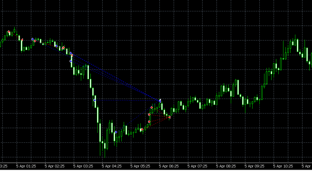 以下の場面は4月5日の昼間にゴールドが下位足で下降していた場面。マルスはこのときは買い 6ナンピンで全決済でしたが、証拠金維持率も1500%はあり、4時間足を見ると順張りの良いロジックでエントリーしているなと感じました。この点を考察したブログ記事を近々アップしたいと思っています。