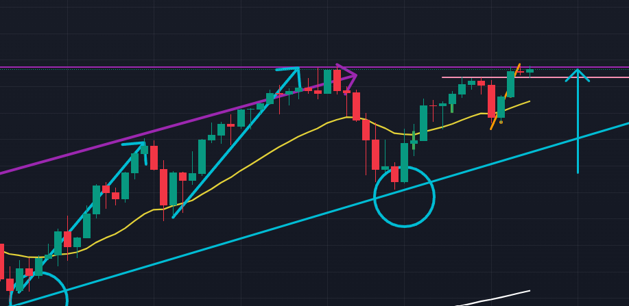 ドル円日足を見てみると(下図)、紫色の上限ラインにコマ足で張り付いたままで下降を開始する様子もないので、一度上抜けしたがっていると読むこともできます。日足レベルで買い圧力がなかなか抜けない状態ということです。この状態から実際にの紫色の上限ラインを抜けると、上昇はかなり大きくなるかもしれません。ただ、抜けた直後に大きく上昇が継続する保証はなく、一度上抜けた後直ぐにリターンムーブをして戻り、そこから上昇することもシナリオとして持っておくことが大切です。