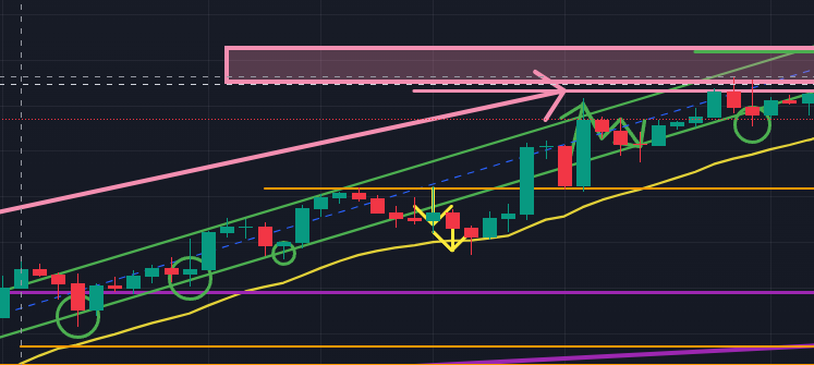 以下はトレーディングビューで同じ場面を5分足で見たものになります。黄色い矢印を見ていただくと分かるのですが、5分足では明らかに下降トレンドに転換しています。