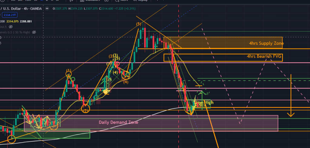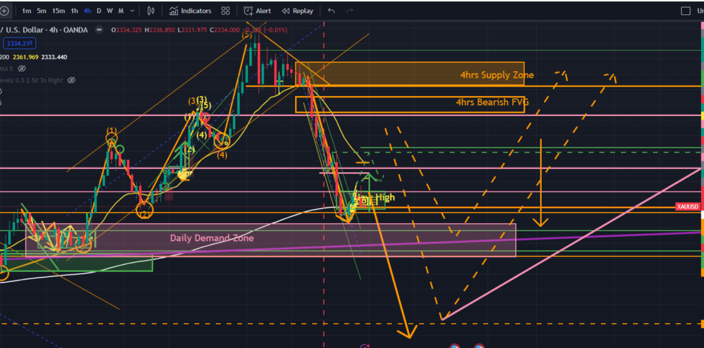 先週末の僕のゴールド予想では、”5/20(月)は上昇5波後の強めの調整下降が入るところから開始するのではないかとイメージしています” と書いていました。結果としては下図オレンジで示しているように、4時間足上昇エリオット波動が4時間足の上昇チャネルの中で推移する中で、5波の起点がその下限3点目反発で大きく上昇し続けました。この上昇により日足ではダウ理論的には上昇トレンド確定となりましたが、その上昇終点で4時間足ではディセトラを形成、強い反転下降の流れへと推移しました。