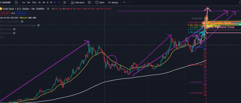 僕は先月4月の半ば頃からゴールドは日足で見たときに上昇3波の終点にあり、次は下降4波の流れというイメージでいましたが、今回のように日足では上昇トレンド形成と日足だけでは流れがつかめせん。そこで月足を見てみると(下図紫色)、小さな月足のエリオット波動の3波と大きな月足のエリオット波動の3波の途上にあることが分かりました。ちなみに、この終点は$2,671を示しています。