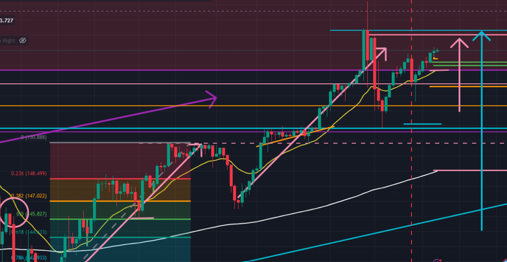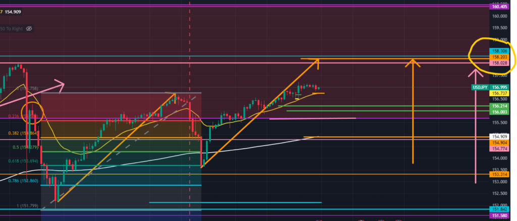以下の4時間足を見ると(オレンジ色)、明確にエリオット波動を描いて上していることが見えてきました。この上昇3波の終点は$158.203にあり、週足で想定した$158.306の上昇点と日足で想定した$158.028の上昇点に挟まれる価格でもあります。