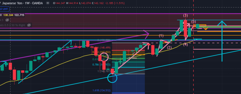 日足で見てみると(下図のピンク色)、大きめのエリオット波動の上昇を3波まで完了した地点での日足サイズのもみ合いで波打っている状況のように見てとれます(先週は上昇して反転した部分を下降4波という見方をしましたが、”現在はまだ明確な下降4波を開始していない” という見方に修正)。日足で見ると、$158.028まで今週中に上昇する可能性があることが見えてきます。