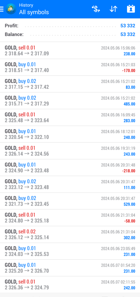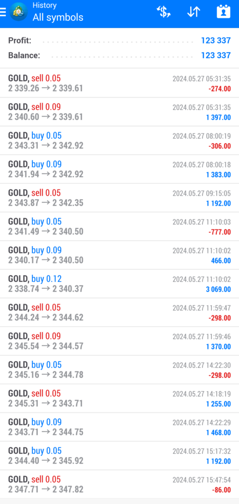 5/27(月)、ゴールドは5分足で見て丸一日上昇トレンドでしたが、マルスは売りポジ最大2、買いポジ最大3とよい順張りをしていました。