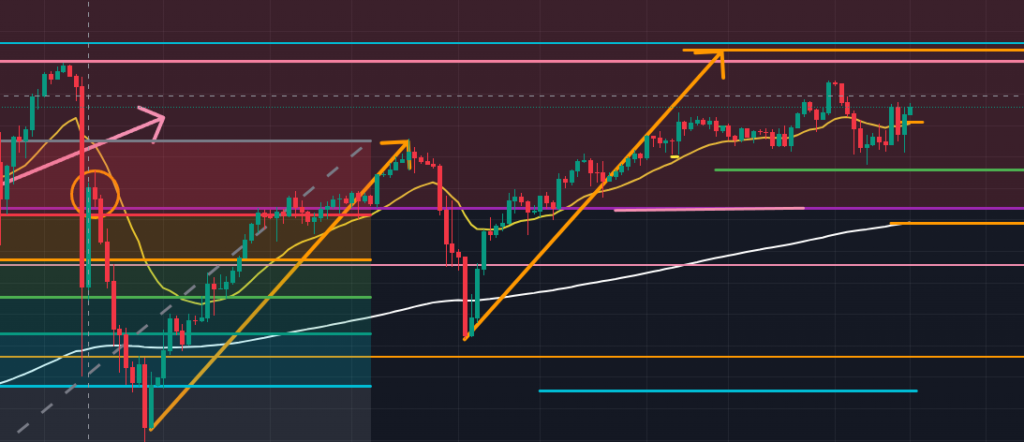 次に日足(下図ピンク)を見てみると、週足で見たのと同様にこちらでも上昇トレンドの構造の中に価格はありますが、先週金曜日に確定した上ヒゲ陰線の状態や日足の燃料の観点からして、$2276.823辺りまで、少なくとも下ヒゲとなる形で下降するシナリオが描けます。