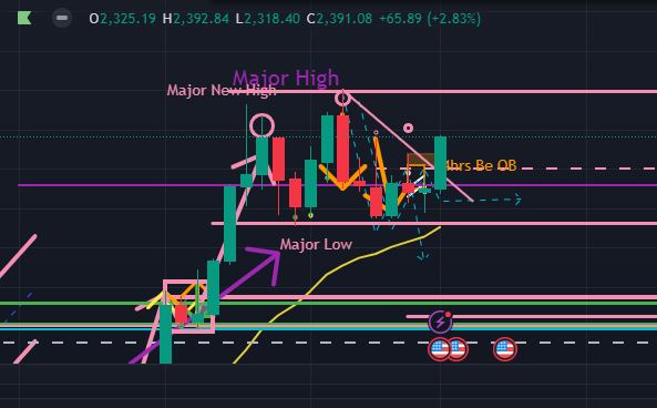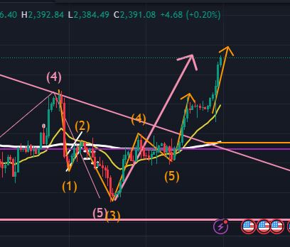 4時間足(以下の図オレンジ) で見ると、日足の下降トレンドラインを上抜ける過程で上昇3波中であるように見ます。今週の水曜日以降にも一旦下降4波で$2361.04付近までは少なくとも下降しそう、というイメージでいます。週前半は、短期足では上目線でよいのではないか、と捉えています。