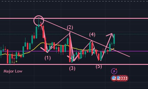 次に日足(下図のピンク)ですが、下図のように下降エリオット波動が完了し、先週に反転上昇で下降トレンドラインを明確に上抜けたのが分かります。今週中に一旦このトレンドラインへ押し目下降の可能性もありますが、週足の視点と合わせても、いずれにせよここから上昇トレンドが生じるという見方でいます。