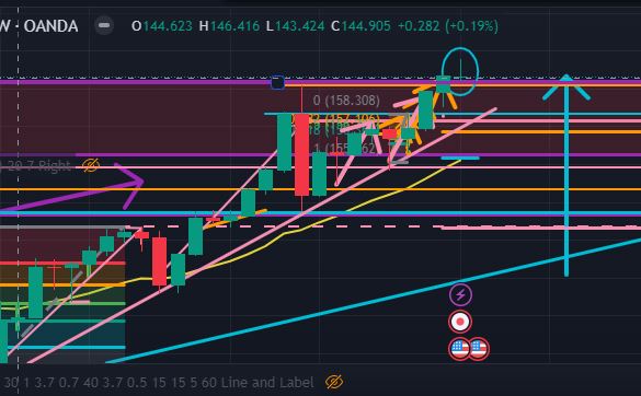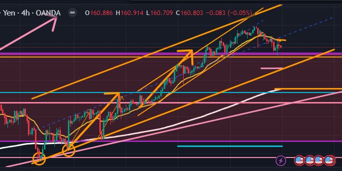 以下は4時間足 (オレンジ色)。4時間足でも上昇チャネル内でダブルボトム転換からの上昇エリオット波動を見ておりましたが、上昇3波が1波に対して伸びすぎているので、現在ドル円は日足のエリオット波動で動いているという見方をした方がよいように思っています。月足の重要水性線(紫色)が硬い抵抗体(@160.405)として機能し先週末の雇用統計では大きな下降が生じませんでしたが、下図からも下降に向かい始めた痕跡は見て取れますね。