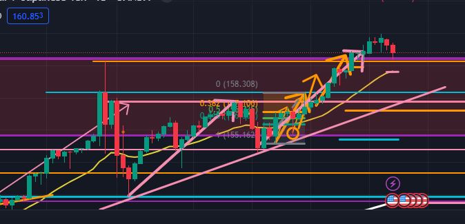 上記より、僕は現在ドル円は日足の上昇エリオット波動をメインに動いており、ターゲットを157.769円として下降に向かうというシナリオをメインにします。ただし、上記4時間足で見た通り月足の重要水平線(@160.405円)が硬い抵抗帯としてあるため、今週中にこれを下抜けられるかどうかで下降のペースが変わるというイメージもしています。