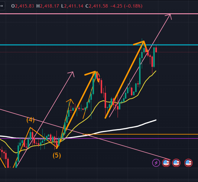 次に日足(下図のピンク)。下図のように、現在は日足の上昇エリオット波動3波の途上にあるように見えます。ただし、$2418.65辺りに週足(水色)の抵抗ラインがあるため、ここから上昇し続けるのは難しいかもしれません。