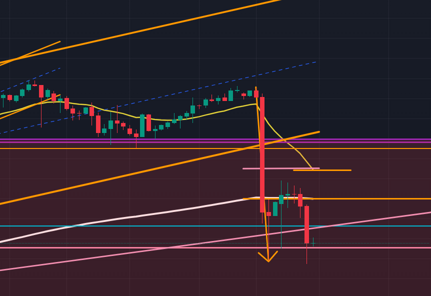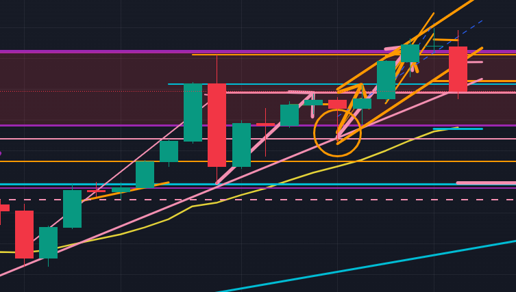 以下は4時間足(オレンジ色)。4時間足では2週間前は下抜けできなかった月足の抵抗ライン(紫色)をCPIの大きな下降エネルギーで下抜けして下降1波を描きました。現在は下降3波の途上ですが、エリオット波動3波は性質上、上位足の抵抗ラインを貫通できません。現在は日足の抵抗ライン(ピンク)に止められていることから、ここからさらに下降するのは難しい状況であると読めます。上記日足では “まだ下目線優位で” と書きましたが、その必要はないかもしれません。ただ、4時間足で完全に上昇トレンドが成立するとすればそれは週後半からではないか?と想像しています。