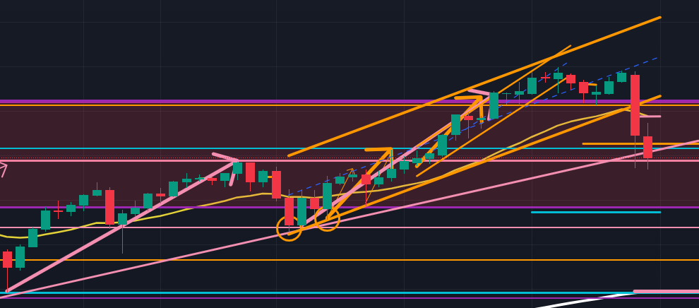 4時間足(以下の図オレンジ) で見ると、小さめの上昇エリオット波動3波までを大きめの上昇1波と見た上昇エリオット波動を5波まで完了させたように見えます。日足の状況と合わせても、週前半はここから一旦反転下降しそうに見えます。なので、週前半は、短期足では下目線でよいのではないか、と捉えています。