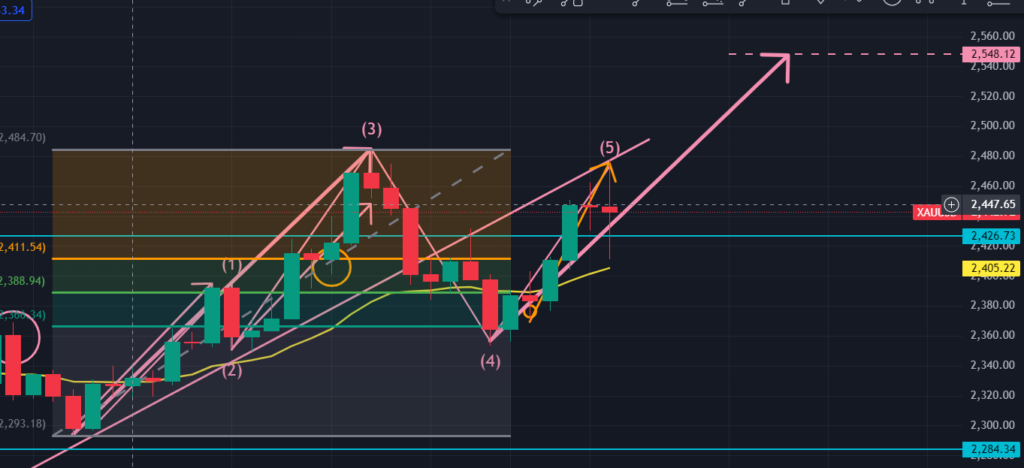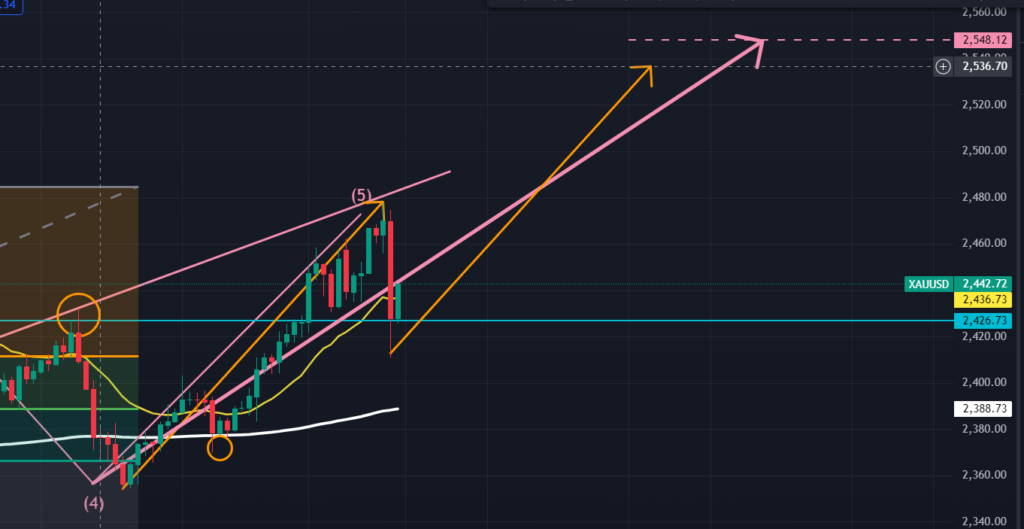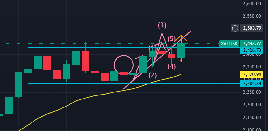 次に日足ですが、以下の図(ピンク)からして、今まで見ていた上昇エリオット波動の下降4波と上昇5波の箇所の値動きが異様に大きく、1波→3波を大きな1波と見なしてフィボを当ててみると、この大きな下降が61.8%で停止していたことが分かります。このことから、この停止価格から現在の価格までの上昇は大きなエリオット波動の3波の途上に既にあるのではないか? というシナリオを描いております。このシナリオでは次のゴールドの上昇のターゲットは$2548.12となります。
