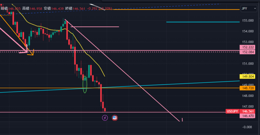 次は4時間足。4時間足では以下の図のように先週金曜日夜の米・雇用統計発表による強い下降が、日足の146.470円で止められているように見えます。陰線がだんだんと短くなっていることからも、下降の勢いは消化されたかもしれません。もちろん今週前半では下ヒゲで抜けてしまうことも考えられます。