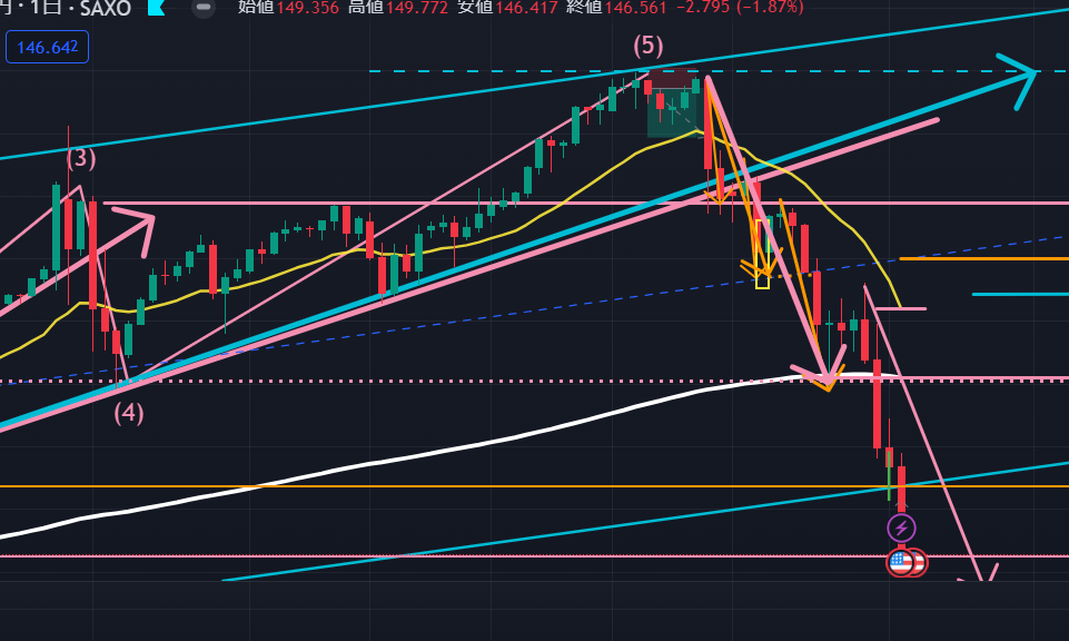次に日足(以下の図ピンク)。日足では先週着目していたトレンド転換ライン(ピンク点線)を実体で明確に下抜けし確定しました。今は週足のエリオット波動で動いている可能性が高いため、日足は状況把握に留めていますが、以下の図日足の20日移動平均線(黄色) が日足の200日移動平均線(白色)とデッドクロスしようと接近しているのが分かります。この状況からしても、今週中にも日足レベルで20日移動平均線へ一度戻り目を付ける形の買い戻し上昇は起こりうる、というイメージでいます。
