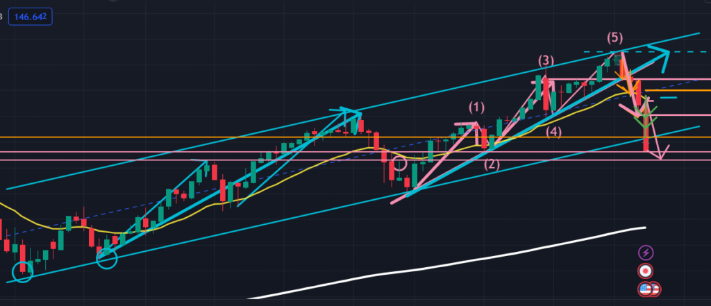 それでは今週の流れを把握するために週足から見ていきます。先週、僕は大きな下降の流れから日足よりも大きなエリオット波動の存在を感じ取り週足を分析し直していたのですが、週足で上昇エリオット波動を特定できたと現時点では思っております。それが、以下の週足図(水色)。この見方に基づき、現在は週足の下降4波の終点付近に価格が位置していると捉えています。水色の週足チャネルライン下限を実体で下抜けしましたが、この下降が日足の下降エリオット波動によるものだと、下降3波でこの貫通は難しかったと考え、週足の上記の見方を優位と思っております。