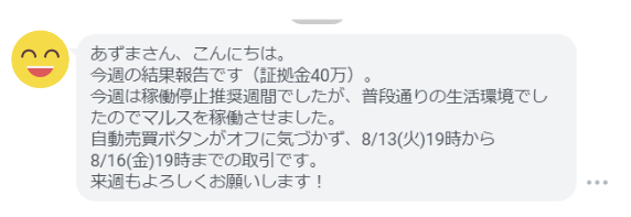 今週は日本がお盆期間で欧米でも夏季休暇期間と重なり、流動性の低下を考慮して稼働停止を推奨、僕の実運用もお休みとしました。