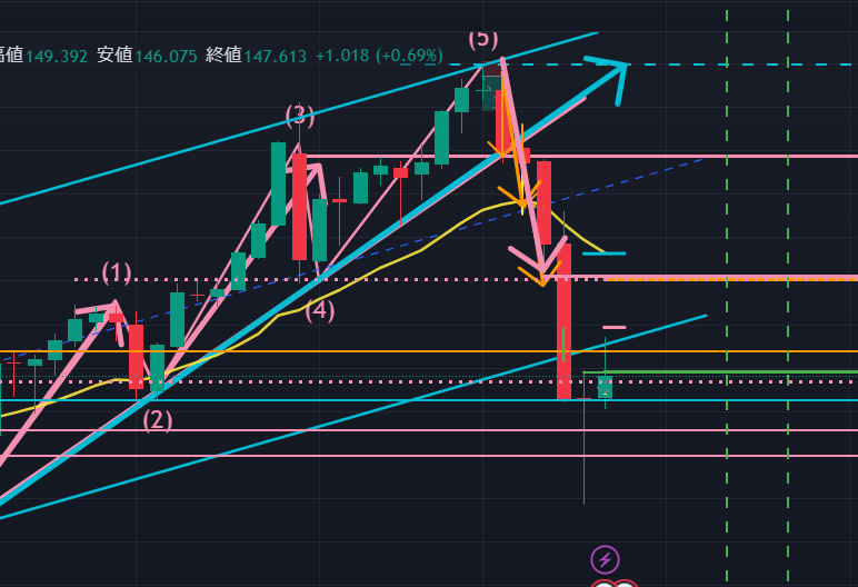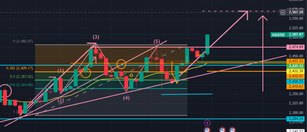 次に日足ですが、以下の図(ピンク)から、左側の大きな上昇エリオット波動1波に対する上昇3波がこの1波のフィボ50%から伸びているように捉えられます。また別の視点では、日足レベルのアセトラから上抜けが開始したとも読めます。いずれにせよ、この2つの視点から日足レベルでGoldはまずは $2,570.29には到達するとイメージしています。週足の状況からすると、次第にこの価格も超えて上昇していく気配がありますね。