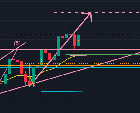 次に日足(以下の図ピンク)ですが、先週は2週間前にロング方向に今まで効いていた$2,474.89周辺の抵抗を上にブレイクしそこへリターンムーブを付ける下降をし、再度上がって来た状況に見えます。そして、注視しておくべきは$2413.42周辺に日足レベルの抵抗帯が存在していることです。週足のマクロ視点ではこれを上抜いて上昇を継続してもおかしくはないのですが、先週はこの抵抗帯に上昇が止められてしまっていました。ドル円がロング方向にいく可能性があることも考慮し、今週は一時的な下降のシナリオも持っていた方がよいかもしれません。