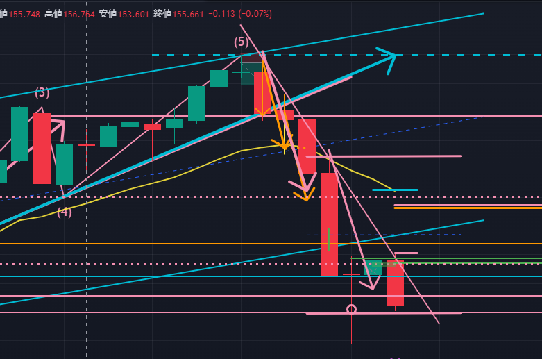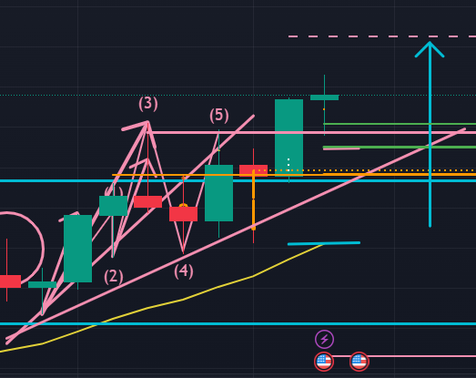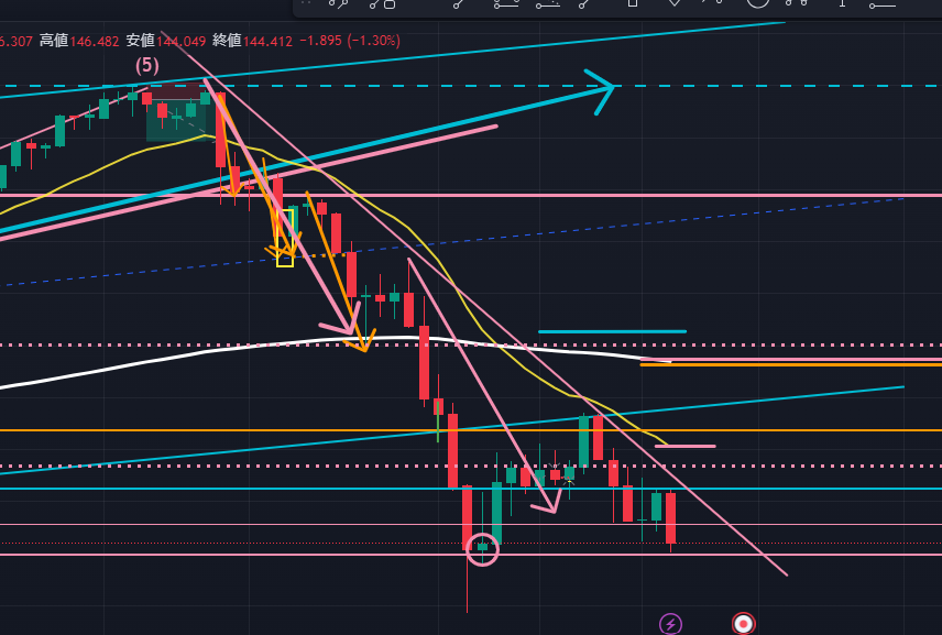 次に日足(以下の図ピンク)。日足では143.955円辺りの日足サポートラインで下降が停止し、そこでダブルボトムのような波形を描く可能性があるように見えます。まだ日足の下降3波の終点に位置している可能性がある、ということです。この流れになった場合、今週ドル円は日足レベルでは上昇4波を描くために再度上昇に転じる可能性もある、ということになります。