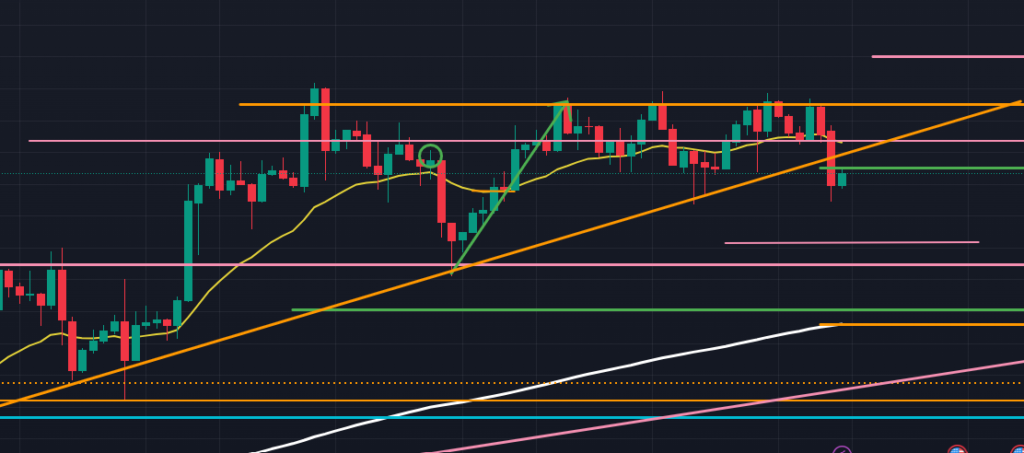 今回は4時間足も確認しました。4時間足(以下の図オレンジ)を見ると、4時間足の上昇トレンドラインを実体で下抜けて確定したのが分かります。4時間足からしても今週下降を継続する可能性は高いでしょう。