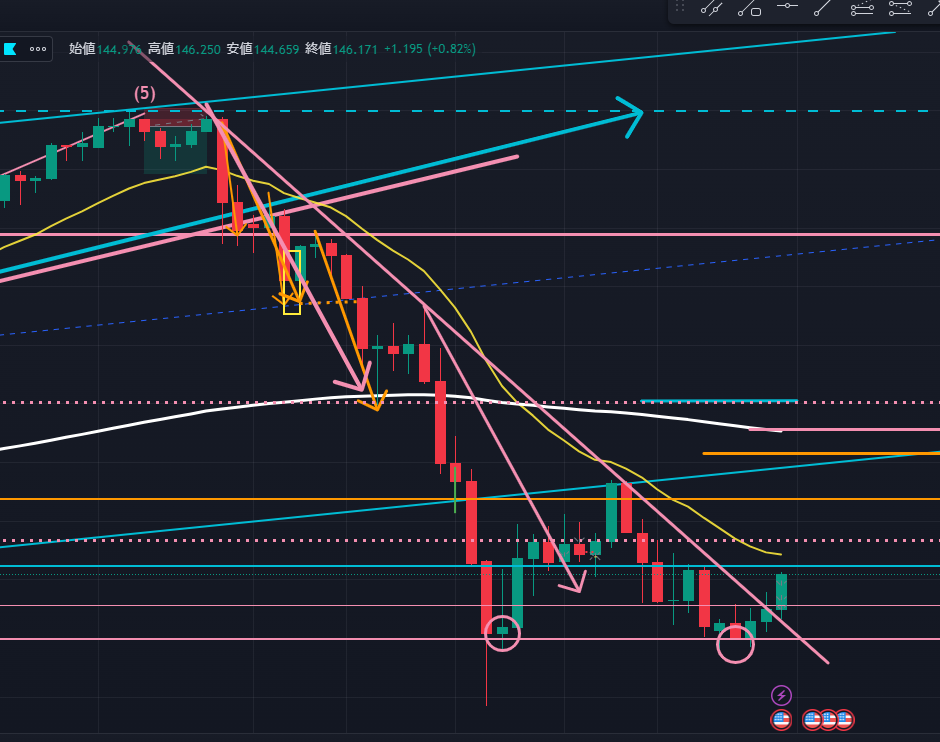 次に日足(以下の図ピンク)。日足では144円のサポートラインでダブルボトムを形成し、そこから上昇し日足の下降トレンドラインを実体で上抜けて確定した状況と言えます。現在の位置から直ぐ上に週足の重要水平線(水色)があるため、今週は一旦この抵抗帯で上昇が止まる可能性もありますが、短期足では上目線優位と言えるでしょう。