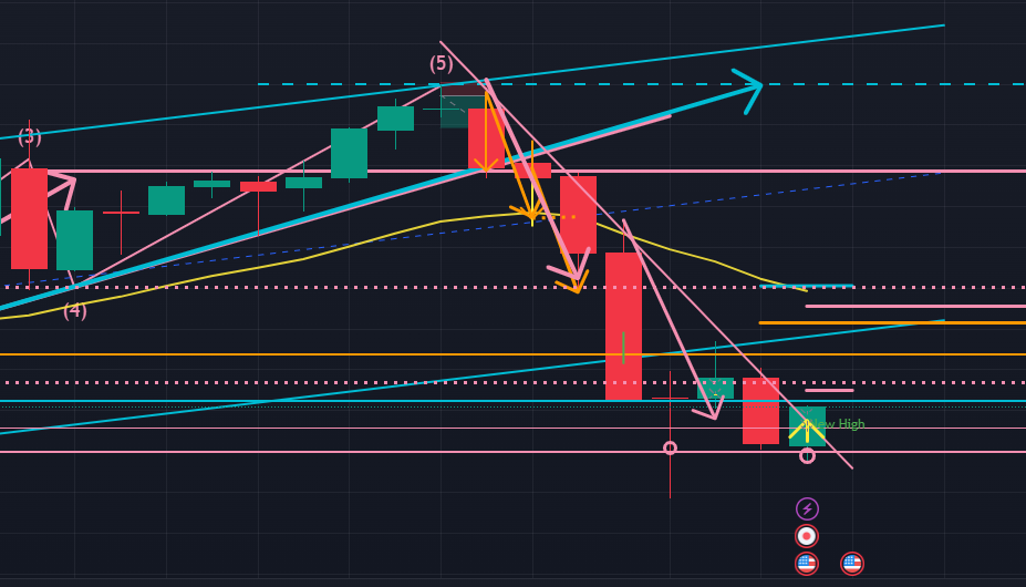 次に日足(以下の図ピンク)ですが、$2413.42周辺でローソク足レンジで水平移動しているように見えます。20日移動平均線(下図黄色)を待っている、あるいはタッチするために現在の価格から下降をもう少し継続する可能性があります。ドル円が日足レベルでまだ上昇の余地があることを考慮すると、下目線が優位と言えます。