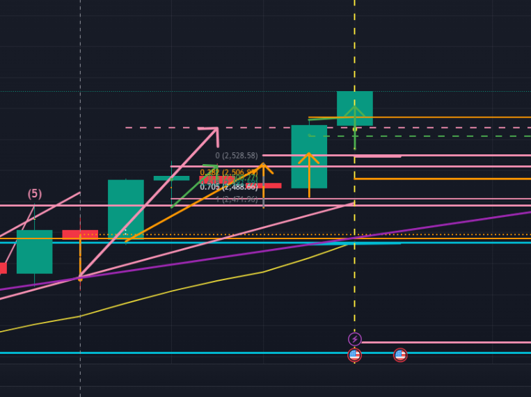 次に日足 ( 下図ピンク )。日足においても、先週一時的に効いていた日足レベルの抵抗帯 ($2588.83)を金曜日に明確に上抜けて確定しました。このラインが日足よりも下位足にとってレジサポ転換ラインとして機能するとすると、今週も4時間足以下では上昇トレンドが継続するのではないか、とイメージできます。