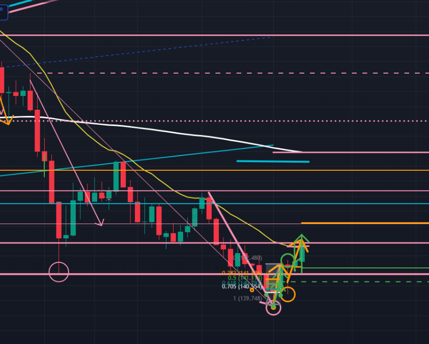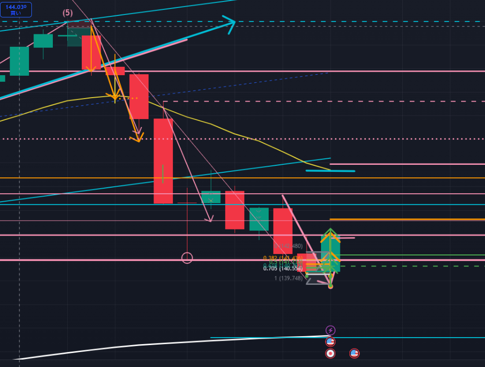 次に日足(下図ピンク)。日足においては、左側に見える長い下ヒゲと15分足、4時間足に現れた逆三尊を考慮すると、フラクタルにより日足でも逆三尊を描く可能性が高まっています。現在は逆三尊の頂点部分を完成させるように上昇している最中、という視点が有力です。先週は143.934円付近にある日足レベルの重要抵抗帯 (ピンク)で上昇が完了しましたが、今週は再度上昇を継続していく可能性が高いのではないかと見ています。