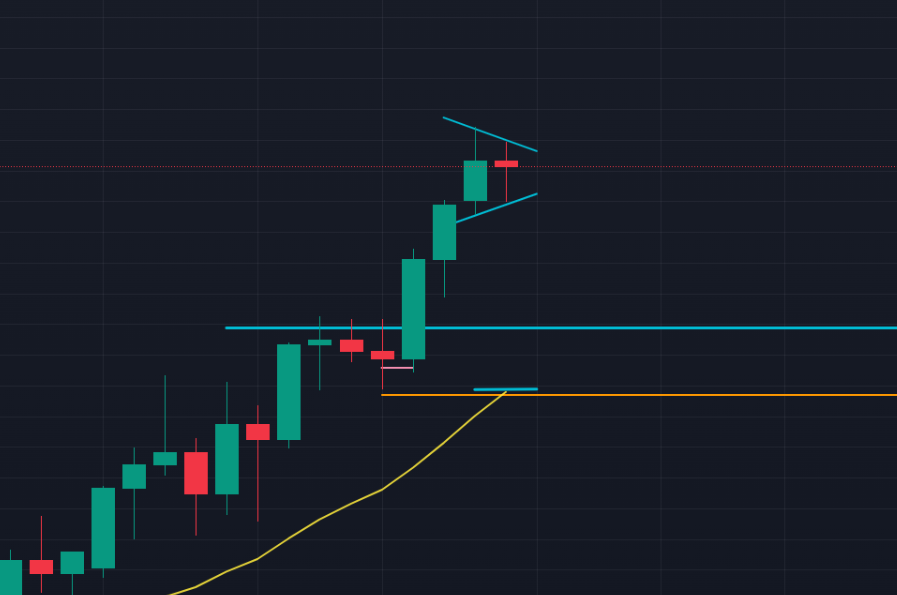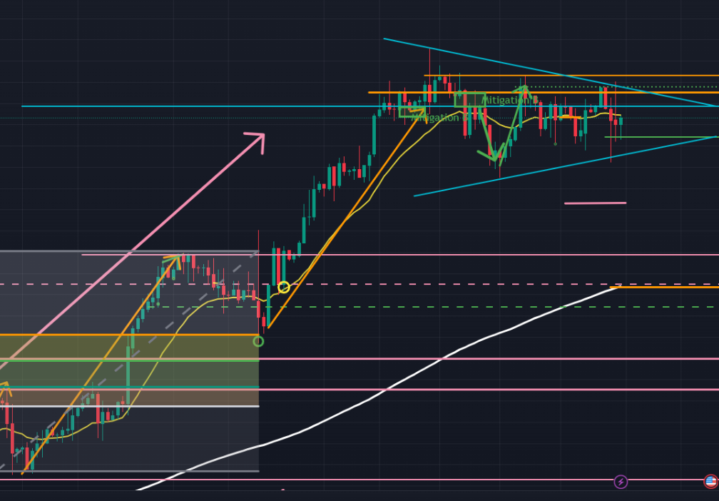 では4時間足(下図オレンジ)。4時間足でもローソク足の状態を見ると、上下にヒゲをだしもみ合っているのがよく見えます。4時間足でも上昇3波の終点でのもみ合いという視点でいるので、次は下降の確率が高いです。