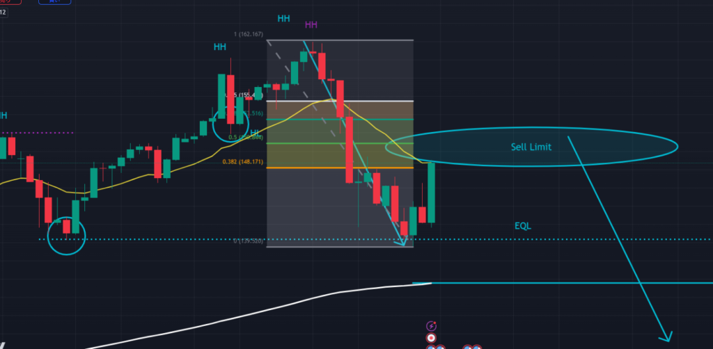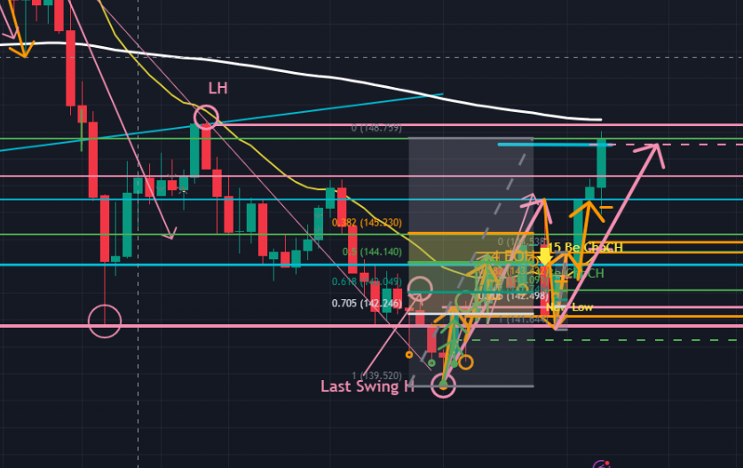 現在はドル円の動きが大きいので今回は月足から確認していきます(下図の紫色)。月足で見ると、ドル円はダウ理論ではまだ上昇トレンドの中におり、先週までに付けた安値で一旦左側にあった安値下の燃料を吸って上に上昇に転じたのが分かります(ここは週足分析で再度見ます)。下図では月足が長い陽線に見えますが10月6日時点、月初の様子なので、これがこういった長い陽線で確定するか、あるいは実体は小さく上ヒゲの長い陽線で完了するかの2通りのシナリオがまだ存在している状態です。経験的にこの波形だと10月の月足は陽線実体のはっきりしたローソク足で完了しそう、と直感はしています。