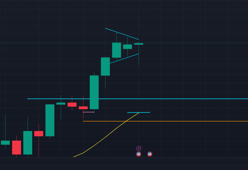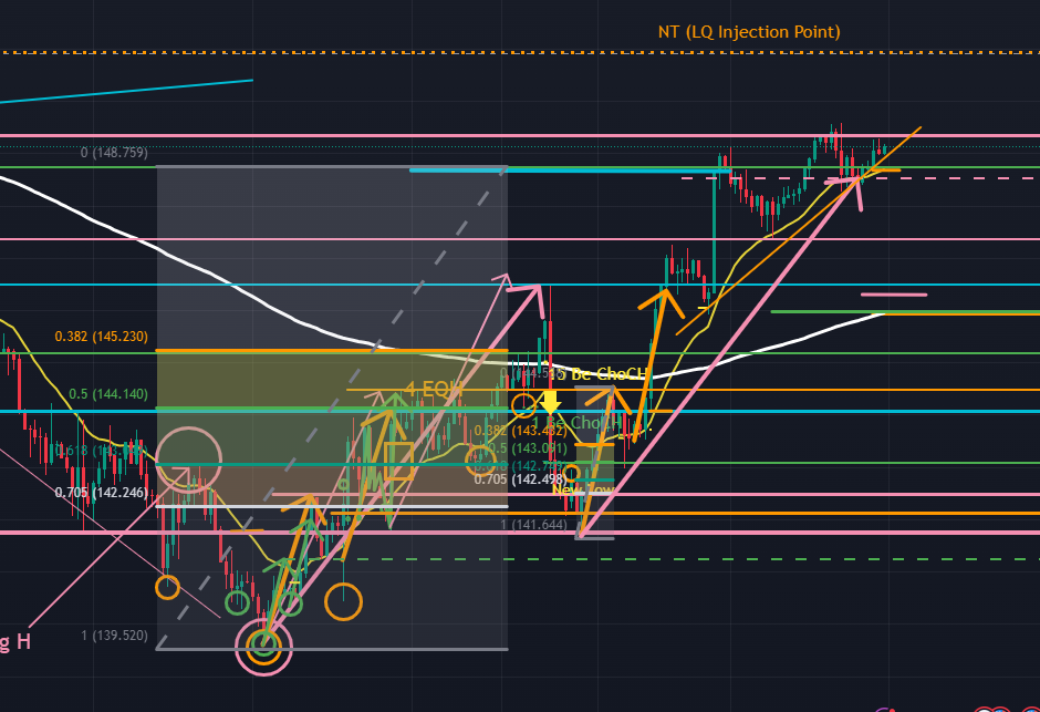 以下は4時間足 (下図オレンジ)。日足の200日移動平均線の下でアセトラを形成しているようにも見えますが、日足の波動の観点では下抜けの確率が高いと読んでいます。