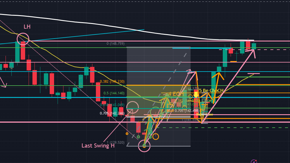 先週頭のドル円の一週間の予想では “値幅的には日足の上昇3波を完成させる長さ分は伸びていますが、149.265円の少し上に燃料がありそうなので、このまま日足の200日移動平均線にタッチするところまで上昇し続ける可能性もあります。現在地またはあと少しの上昇後に下降4波となる” と書いていました。