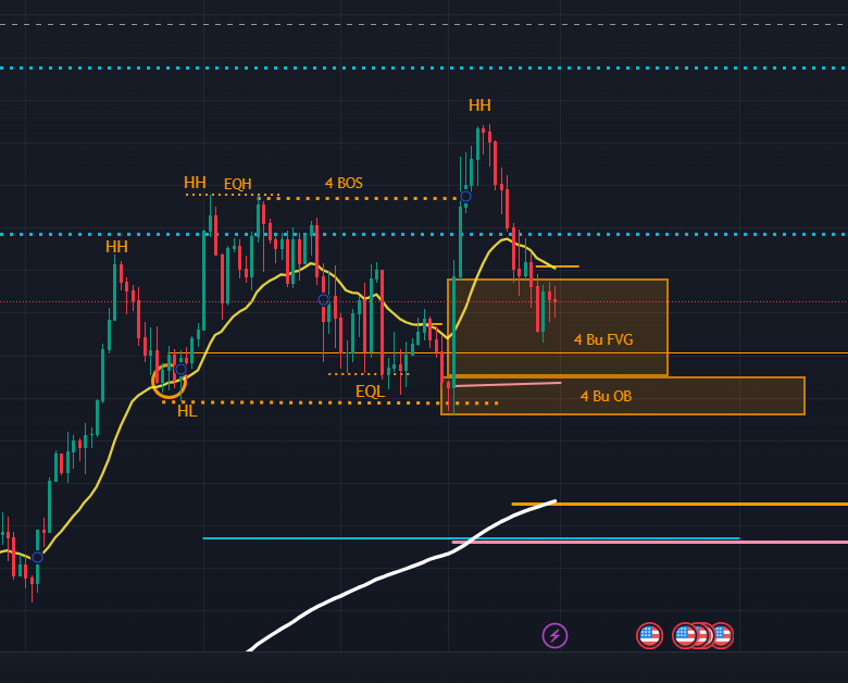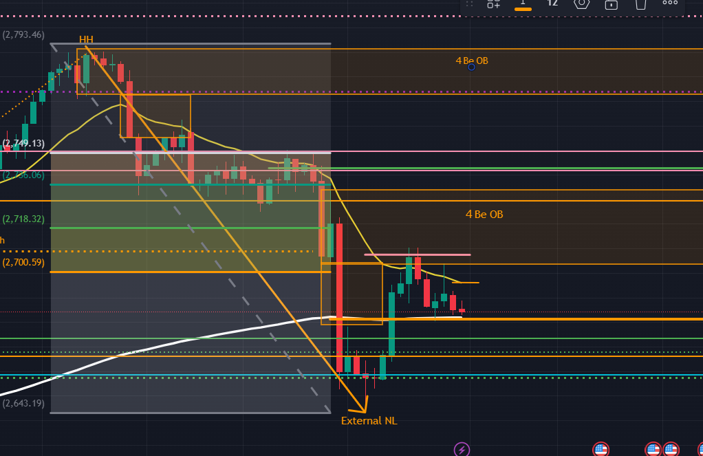 次に4時間足 ( 下図 オレンジ ) ですが、日足で見ていた方向とは逆に、下降インパルスが現れているように見えます。日足でイメージした流れと拮抗してしまうのですが、4時間足の20日移動平均線が上からこのまま押さえつけてくるようであれば、4時間足の200日移動平均線の下に価格は潜っていき、4時間足の下降3波となる可能性も見えます。その場合、下降のターゲットは週足のサポートラインの$2657.09となるでしょう。