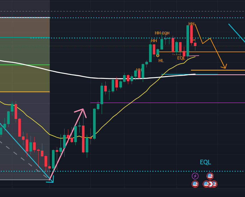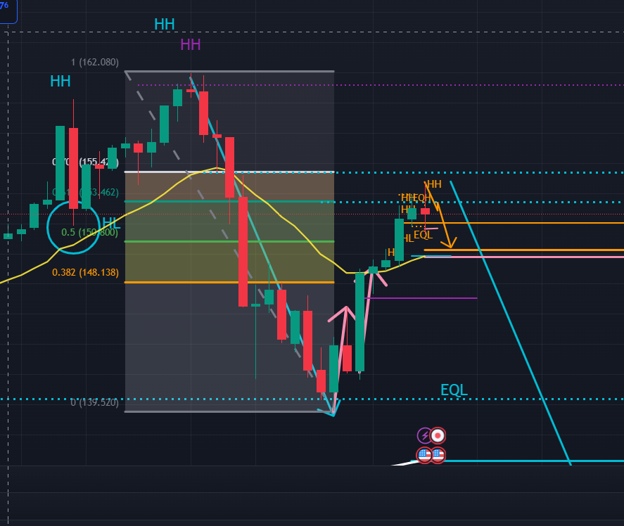 4時間足も見ておきます( 下図オレンジ色 )。4時間足はダウ理論ではまだ上昇トレンドの中にあります。意識されている153.421円を超えて上昇していく可能性も現状見てとれますね。