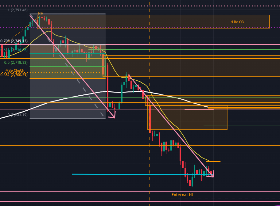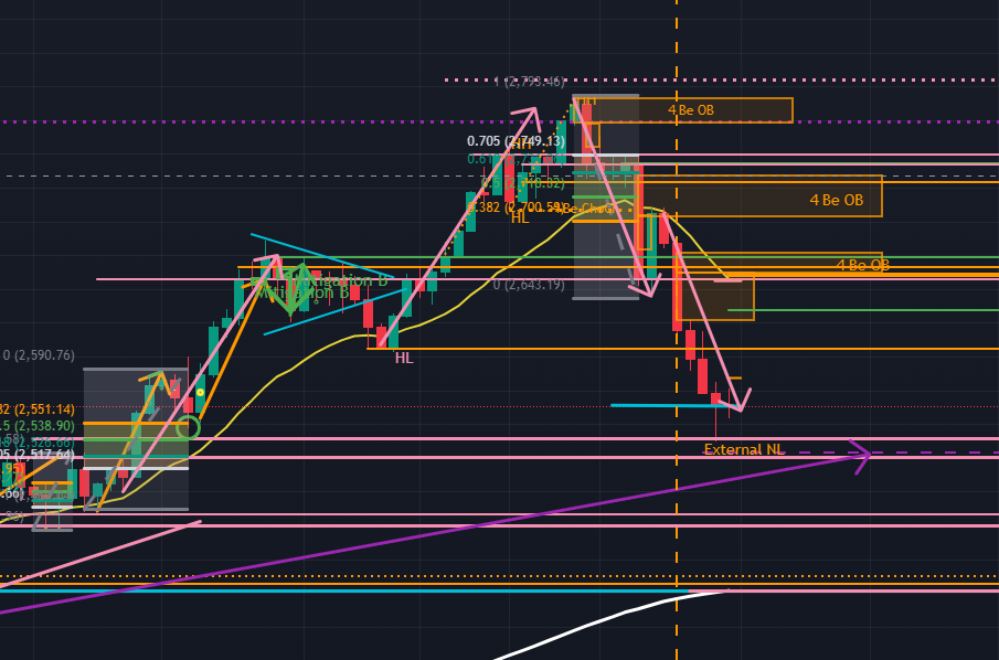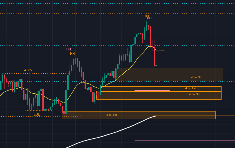 4時間足も見ておきます ( 下図オレンジ色 )。4時間足もダウ理論ではまだ上昇トレンドの中にあります。4時間足単体で見れば再度ここから上昇していってもおかしくはない状況ですが、週足や日足の状況を見ると、今週一週間全体を通して上昇し続ける可能性は低いのではないか、と観ています。