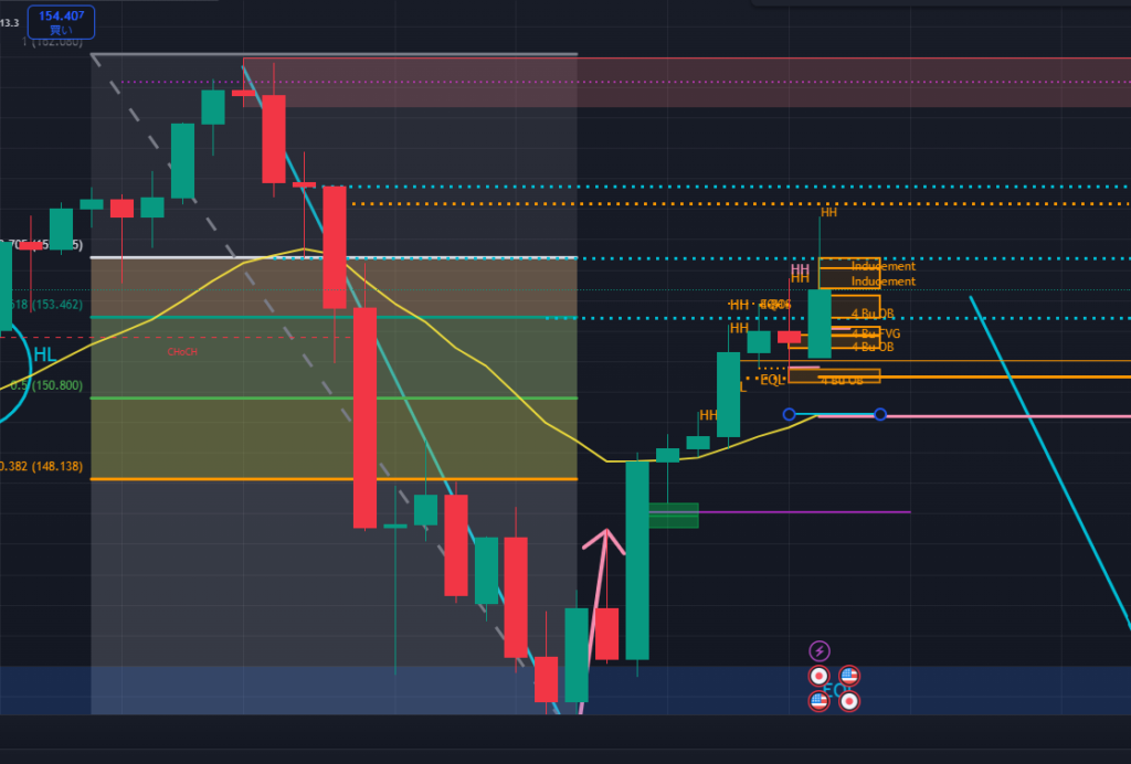 先週頭のドル円の一週間の予想では “週足レベルの上下の優位性は、今週の週足が完成するのを待って観察する必要あり . . . 日足の20日移動平均線が意識されれば、これがサポートとなりドル円は下降しにくくなる . . . 4時間足はダウ理論ではまだ上昇トレンドの中にある。意識されている153.421円を超えて上昇していく可能性も現状見てとれる” と書いていました。