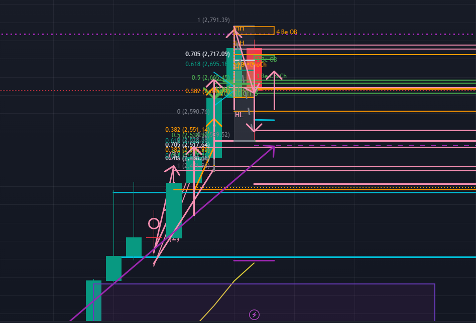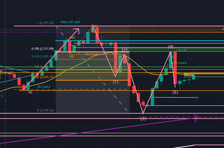 次に週足 (下図の水色)。ゴールドは現在は週足では動いていませんが、本日別記事で解説したローソク足レンジ理論によるERL-IRLの転換シグナルは出ています。波形的にはここからWトップを描いて月足の目線に沿うように再度強い下降トレンドになりそうな気配がありますね。