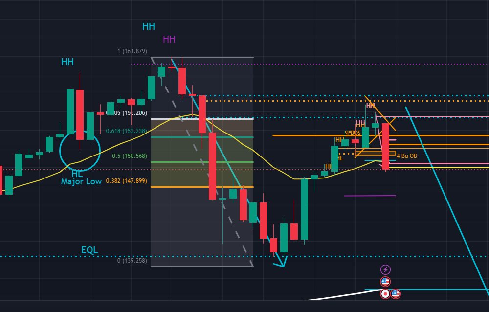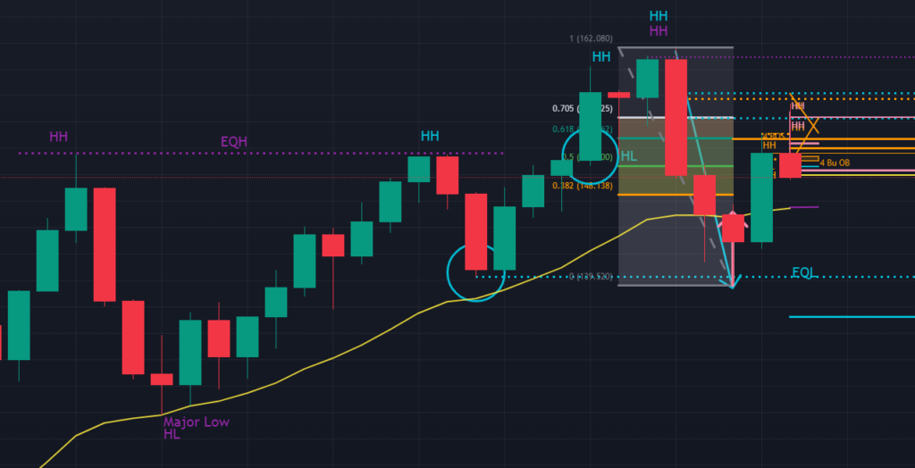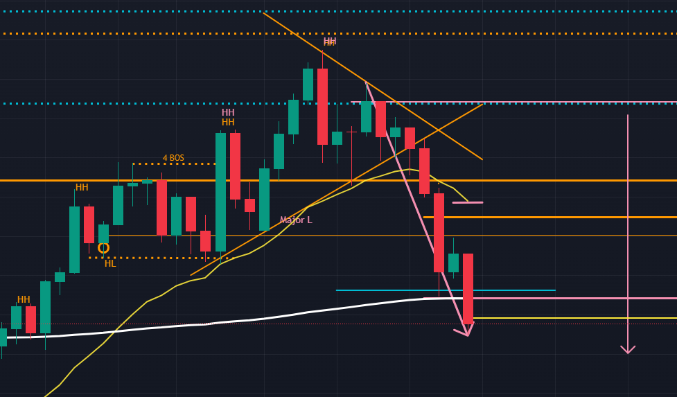 今週から12月月初ということで、月足から確認していきます (下図の紫色)。月足はダウ理論の観点ではまだ上昇トレンドの中にあるものの、11月に完成したローソク足を見るに上ヒゲが長いため、売り勢がとても強い状況であることが分かります。この状況からして、少なくとも12月前半は上位足では下目線優位の相場となりそうです。