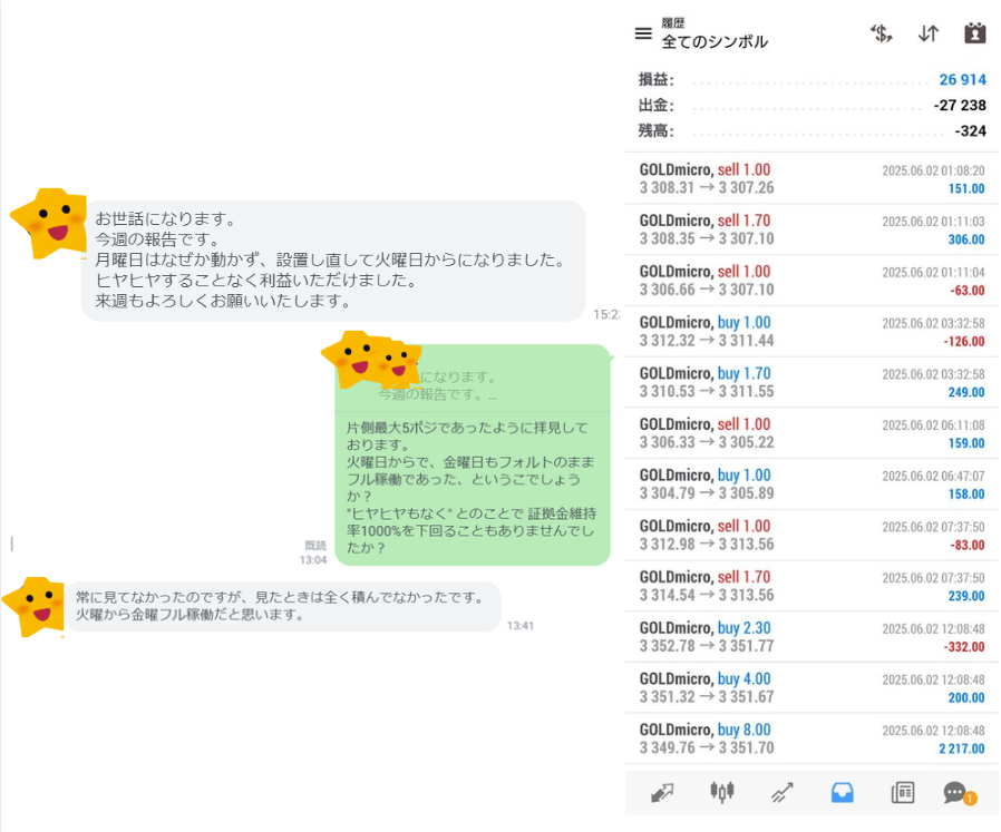 月曜と水曜の自動指標停止とこのEA本来の厳選エントリーロジックが効いた週で、